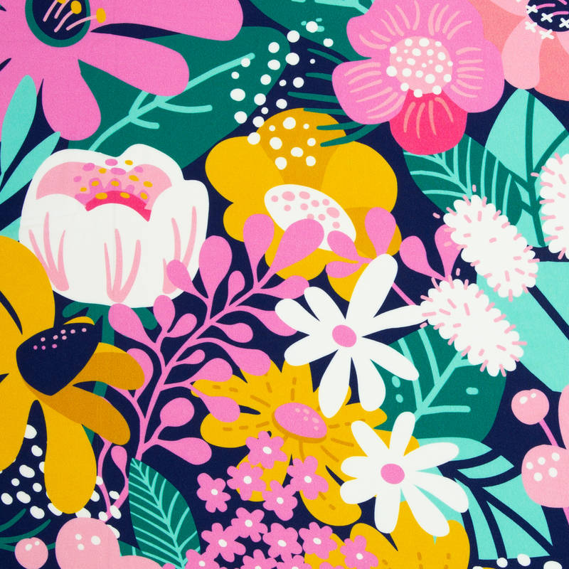 Deze viscose is een echte eyecatcher. Een diepe donkere ondergrond met een explosie aan kleur: fuchsia, roze, turquoise, geel en frisse groentinten komen samen in een speelse, bloemenprint.