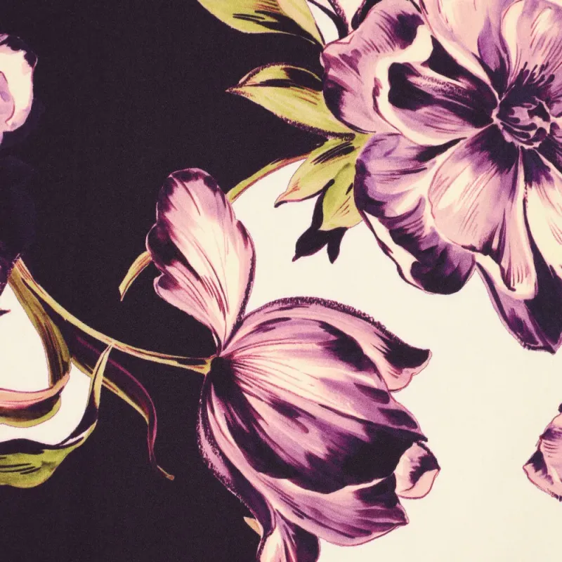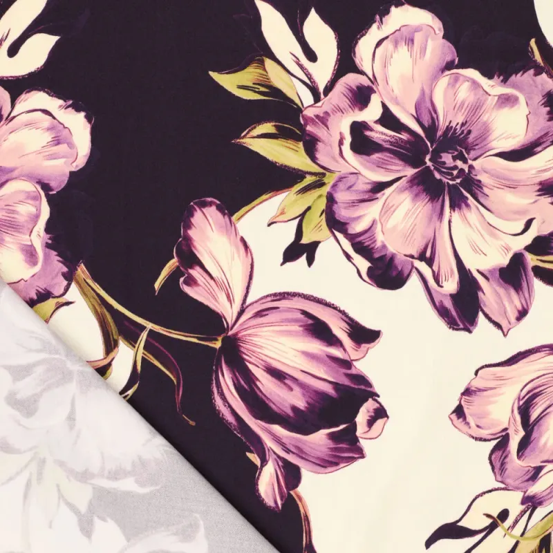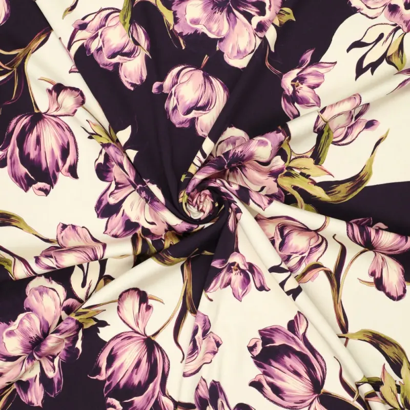 Deze viscose satijn met tulpenprint is een echte blikvanger. De stof heeft een subtiele glans en voelt heerlijk soepel en zacht aan. Door de mooie valling beweegt de stof elegant met je mee, wat zorgt voor een luxe uitstraling in elk kledingstuk.
