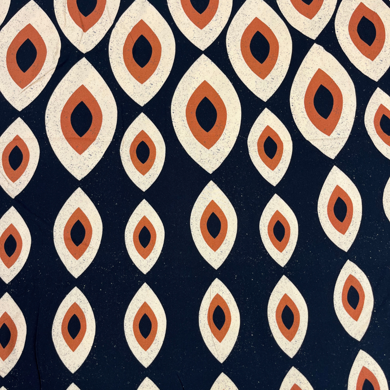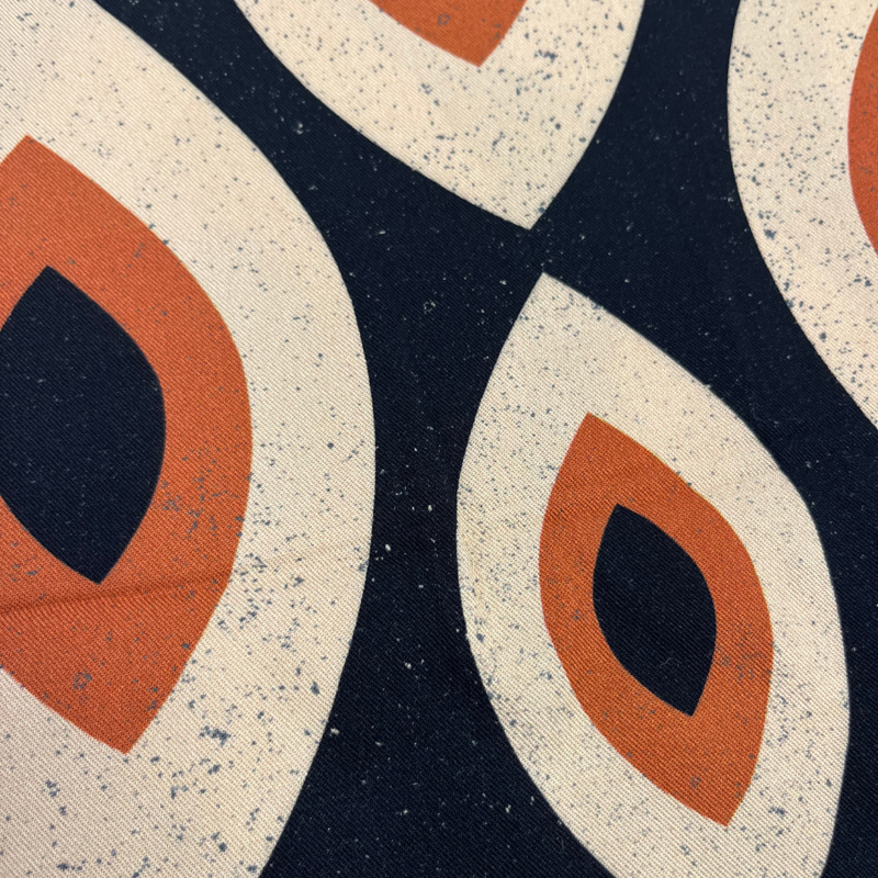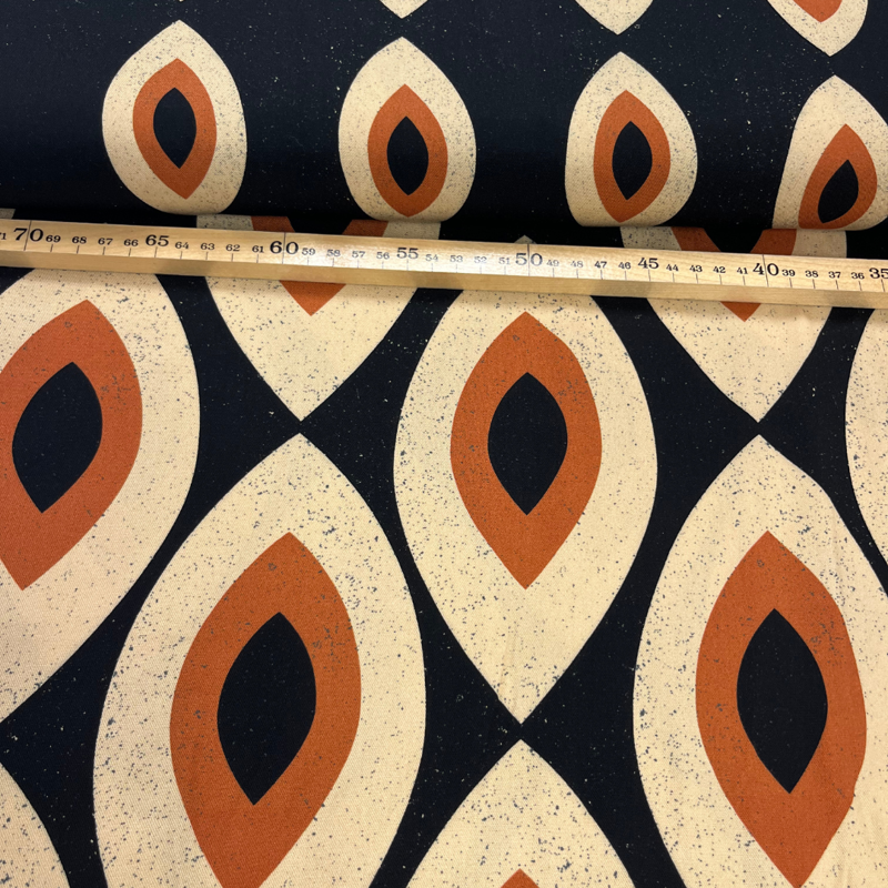 Een stijlvolle viscose twill met een grafische retroprint in warme roest- en ecrutinten op een diepblauwe ondergrond. De stof heeft een subtiele diagonale weving (de zogenaamde twill), waardoor hij nét wat steviger aanvoelt dan gewone viscose, maar toch soepel en elegant blijft vallen.