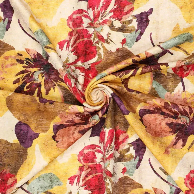 Deze soepele viscose is er zo eentje waar je direct zomerse kriebels van krijgt. Een prachtig bloemendessin in warme geel- en zandtinten, gecombineerd met accenten van bordeaux, oudroze, paars en een vleugje groen. De print heeft iets schilderachtigs en levendigs, maar blijft tegelijk rustig en draagbaar.