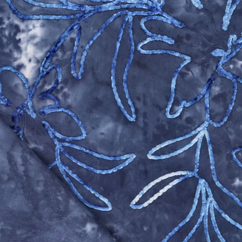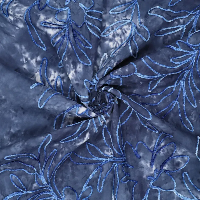 Deze geborduurde stof met tie dye effect is een echte blikvanger. De combinatie van een zachte katoenen basis met rijk borduurwerk geeft de stof een luxe, ambachtelijke uitstraling. Het tie dye proces zorgt voor een speels kleurverloop, terwijl het borduursel diepte en structuur toevoegt.
