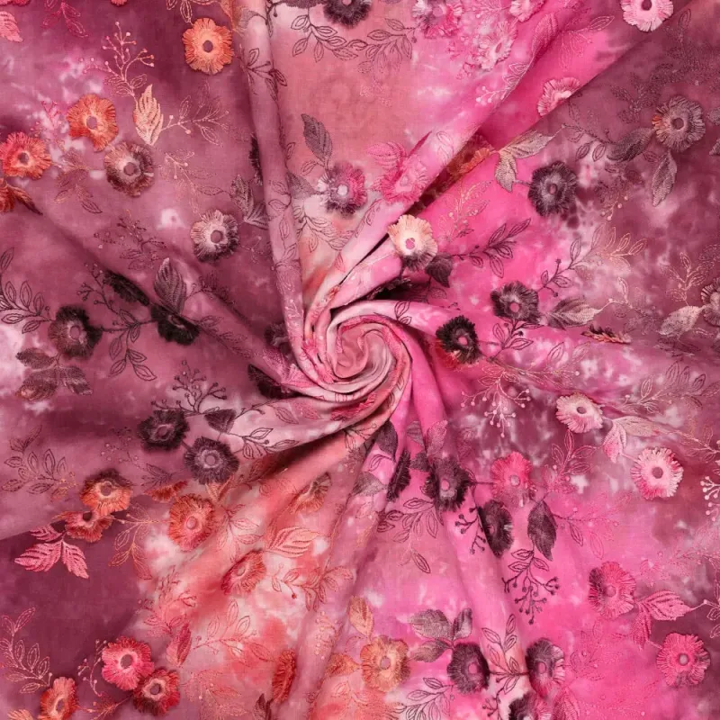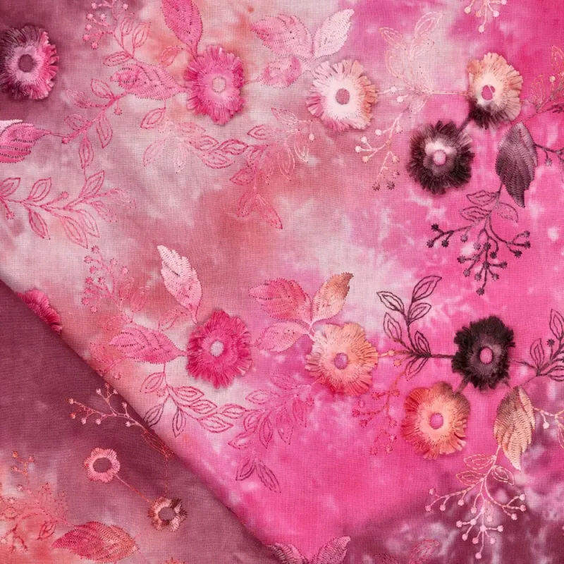 Deze geborduurde stof met tie dye effect is een echte blikvanger. De combinatie van een zachte katoenen basis met rijk borduurwerk geeft de stof een luxe, ambachtelijke uitstraling. Het tie dye proces zorgt voor een speels kleurverloop, terwijl het borduursel diepte en structuur toevoegt.