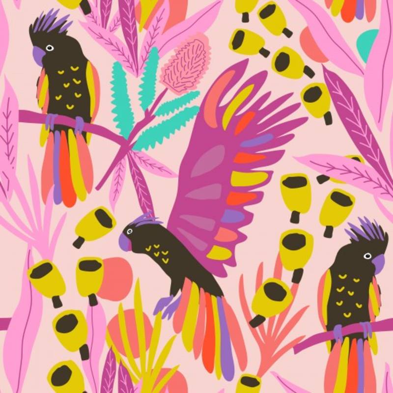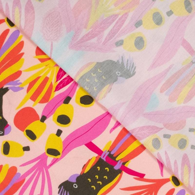 Deze vrolijke katoen poplin uit de Karina+ Kind collectie is een echte blikvanger. De speelse papegaaienprint in frisse kleuren op een zachte roze ondergrond zorgt direct voor een zomers en energiek gevoel.