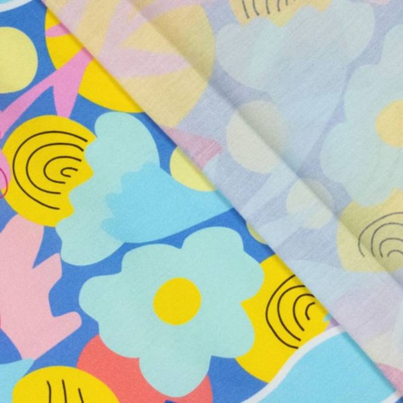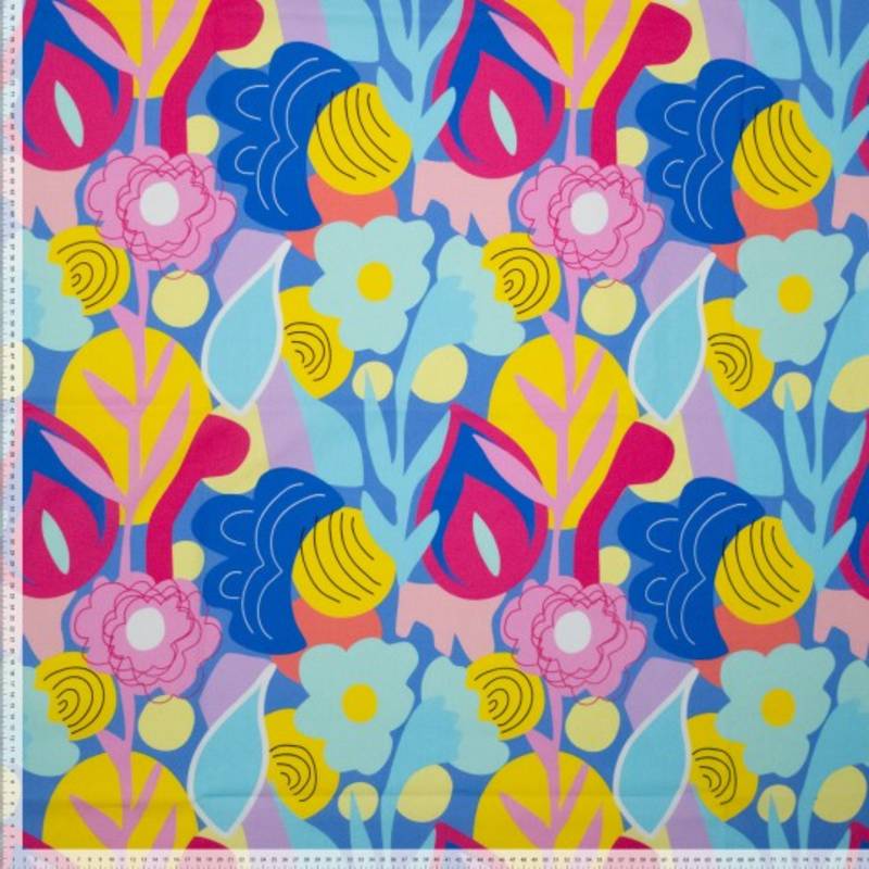 Deze opvallende katoen poplin uit de Karina+ Kind collectie is een echte blikvanger. De abstracte bloemenprint met frisse kleuren zoals blauw, geel en roze zorgt voor een levendig en zomers geheel.