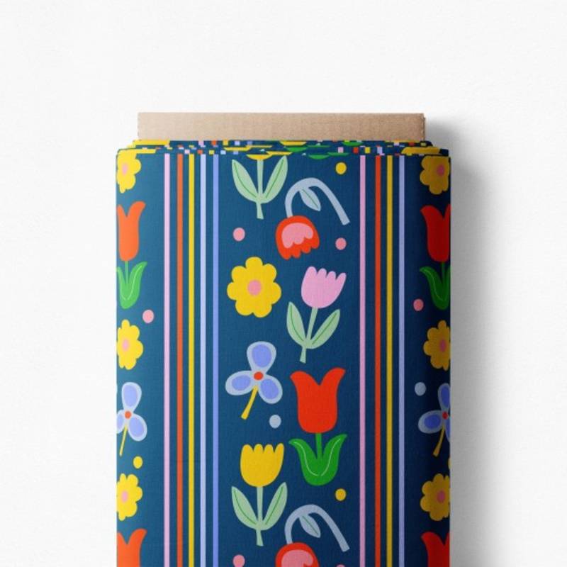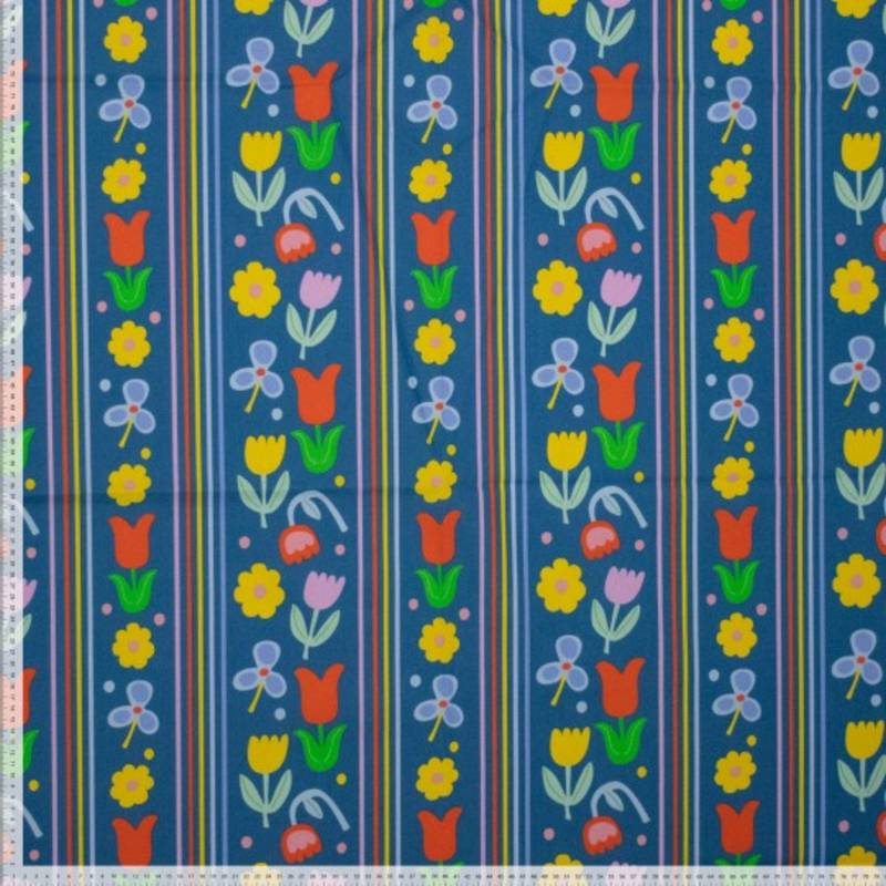 Deze vrolijke katoen poplin uit de Karina+ Kind collectie heeft een speelse combinatie van bloemen en strepen. De frisse kleuren op een blauwe ondergrond zorgen voor een levendig en tegelijkertijd rustig geheel.