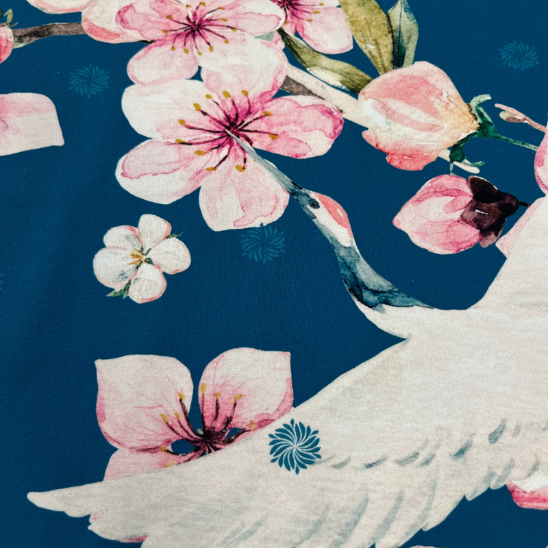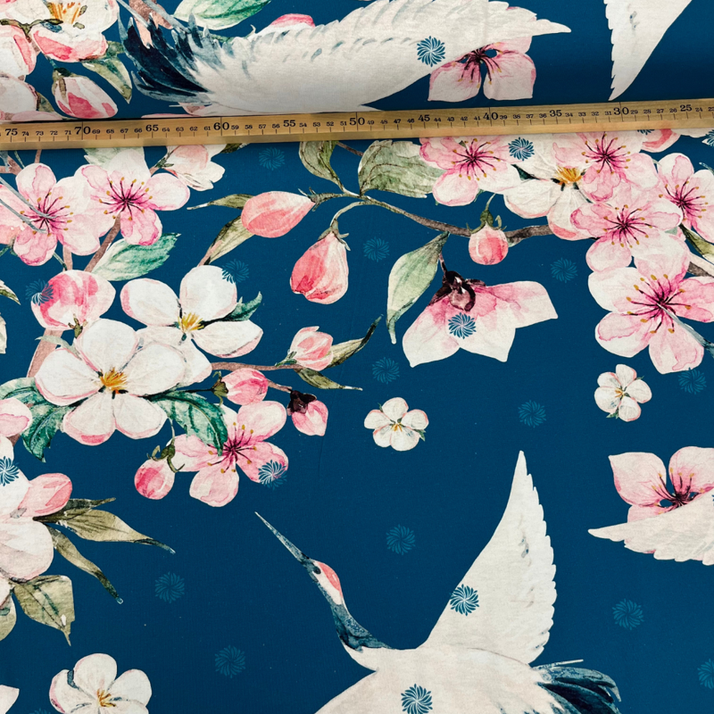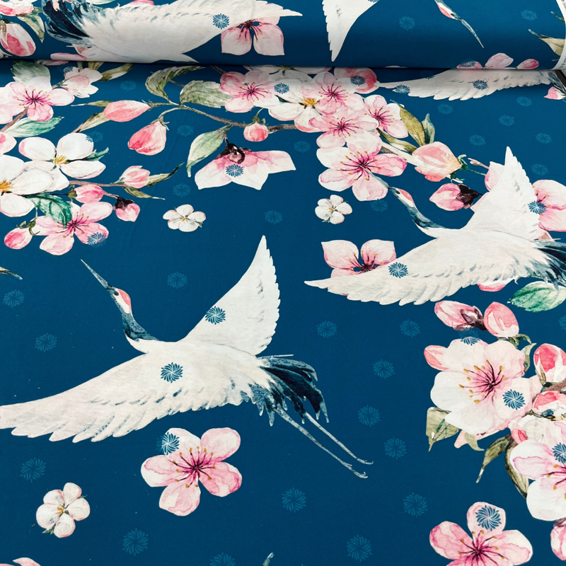 Wat een plaatje is deze tricot! Een diep petrolblauwe ondergrond met sierlijke witte kraanvogels en roze bloesemtakken zorgt voor een stijlvolle, bijna Japanse uitstraling. De stof is heerlijk soepel, zacht en heeft een fijne stretch door de 5% elastan.